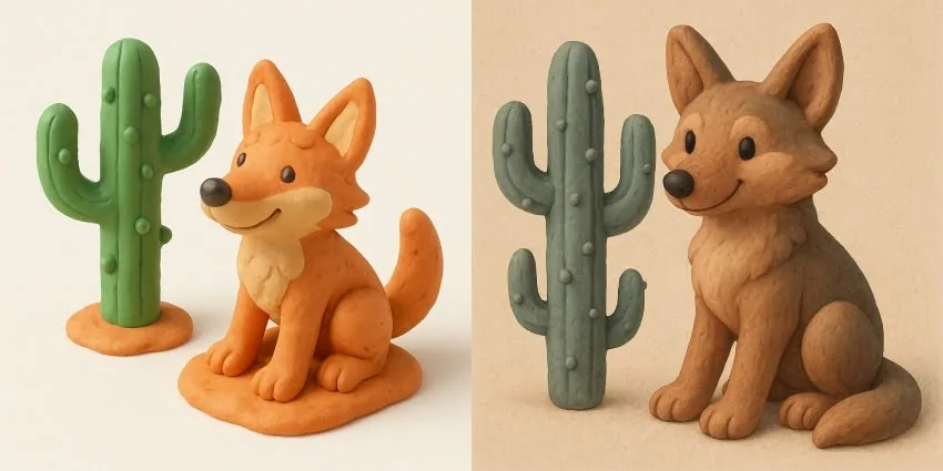 A 3D illustration rendered in a charming, clay-like style, featuring a friendly coyote and a sturdy, stylized cactus. The coyote should appear as if it’s been hand-sculpted from soft, pliable clay, with visible, subtle finger marks or tool impressions. Its form should be rounded and slightly exaggerated, with a curious or playful expression. The cactus should also have a distinctly sculpted feel, with soft, organic edges and perhaps a few small, rounded “spines” that look like they were individually pressed on. The colors should be muted and earthy, like natural clay tones, with a matte finish. The overall mood is whimsical and approachable.