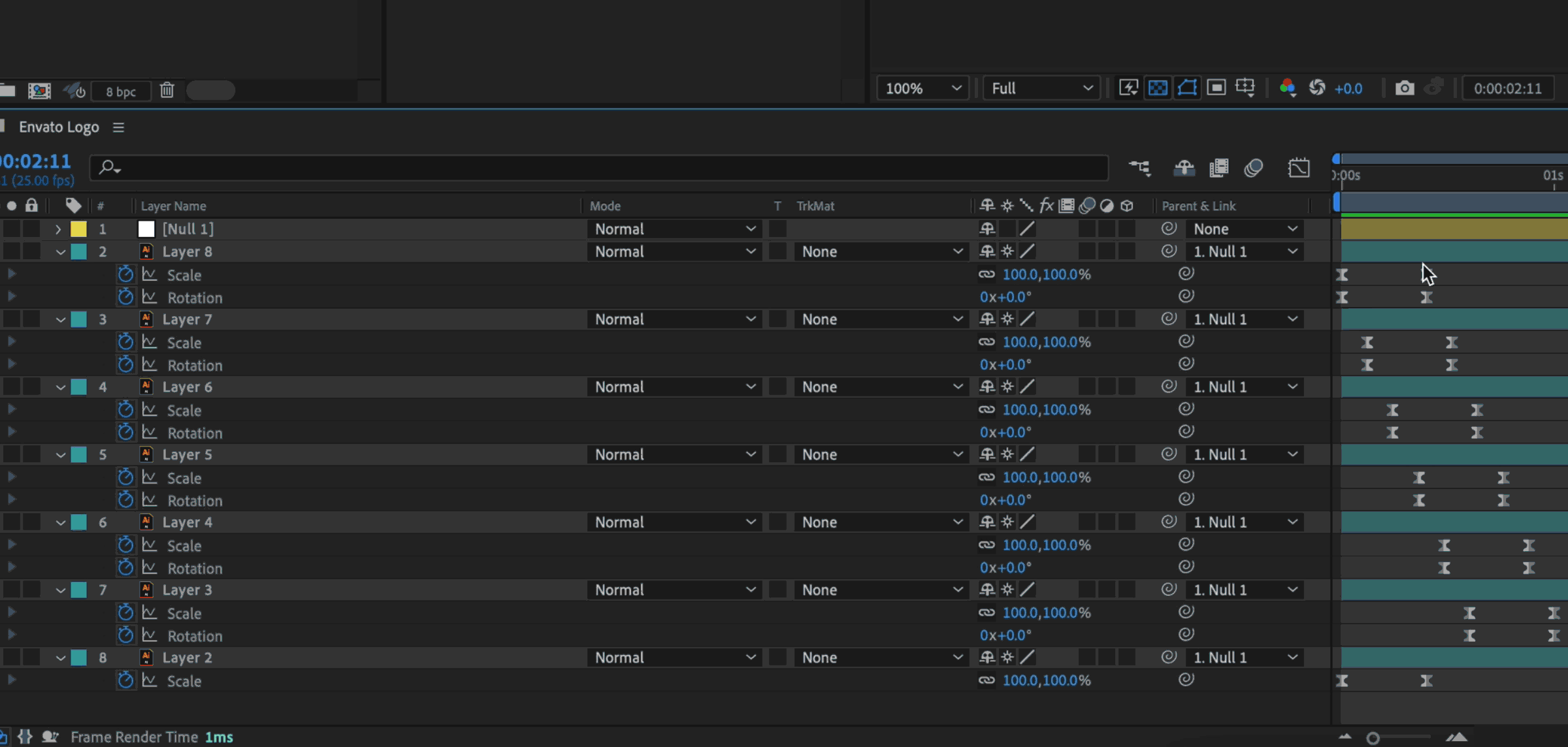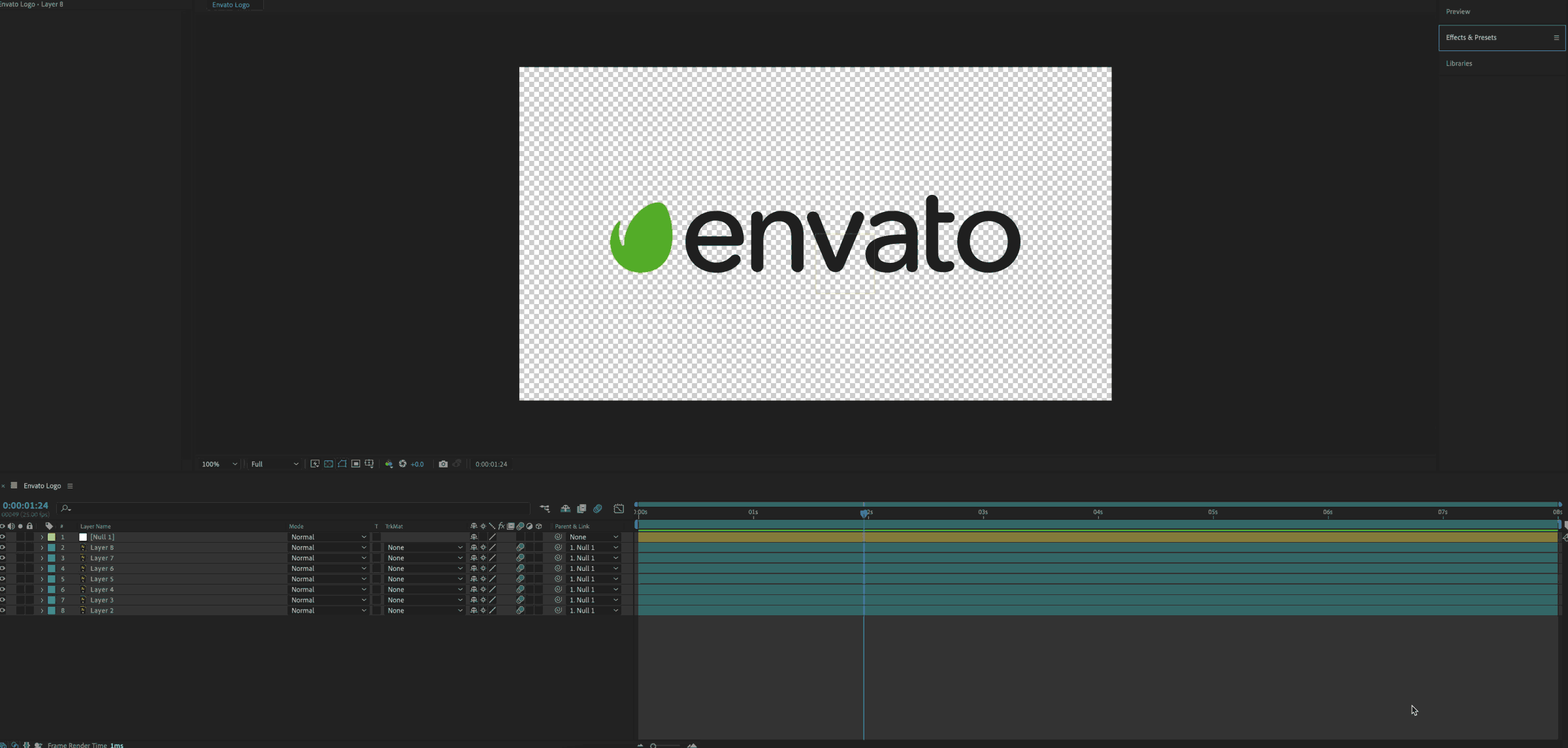 This means the Null is now a master control for all your logo layers, so you can collectively edit properties like Scale and Position for all layers via the Null layer.