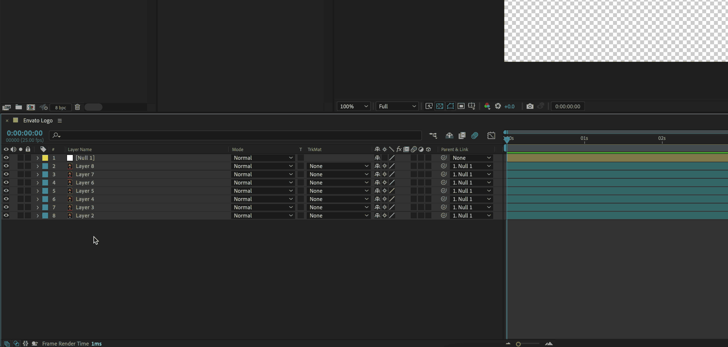 Next, select all the logo layers in your timeline except for the Null Object. Then, find the Parent & Link column in your timeline panel, click the drop-down box for any of your selected layers, and choose the Null Object. All your logo layers will now be parented to the Null.